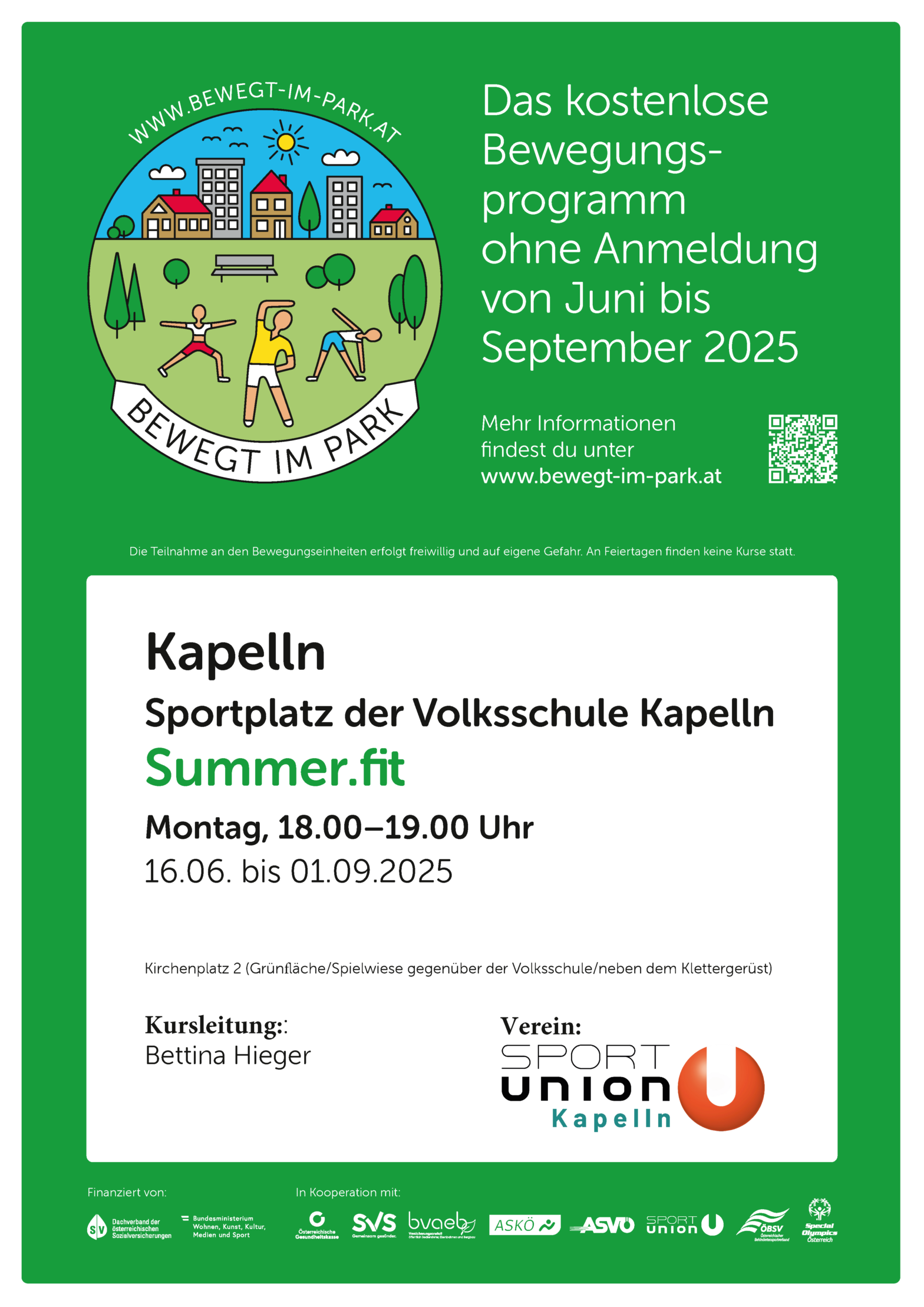 Summer.fit in Kapelln ist ein kostenloses Ganzkörpertraining im Rahmen der österreichweiten Initiative Bewegt im Park. Es kombiniert Kraft, Ausdauer und Koordination mit funktionellem Training, bei dem mehrere Muskelgruppen gleichzeitig aktiviert werden. Alle Übungen werden in verschiedenen Schwierigkeitsgraden angeboten, sodass sowohl Anfänger:innen als auch Fortgeschrittene teilnehmen können.